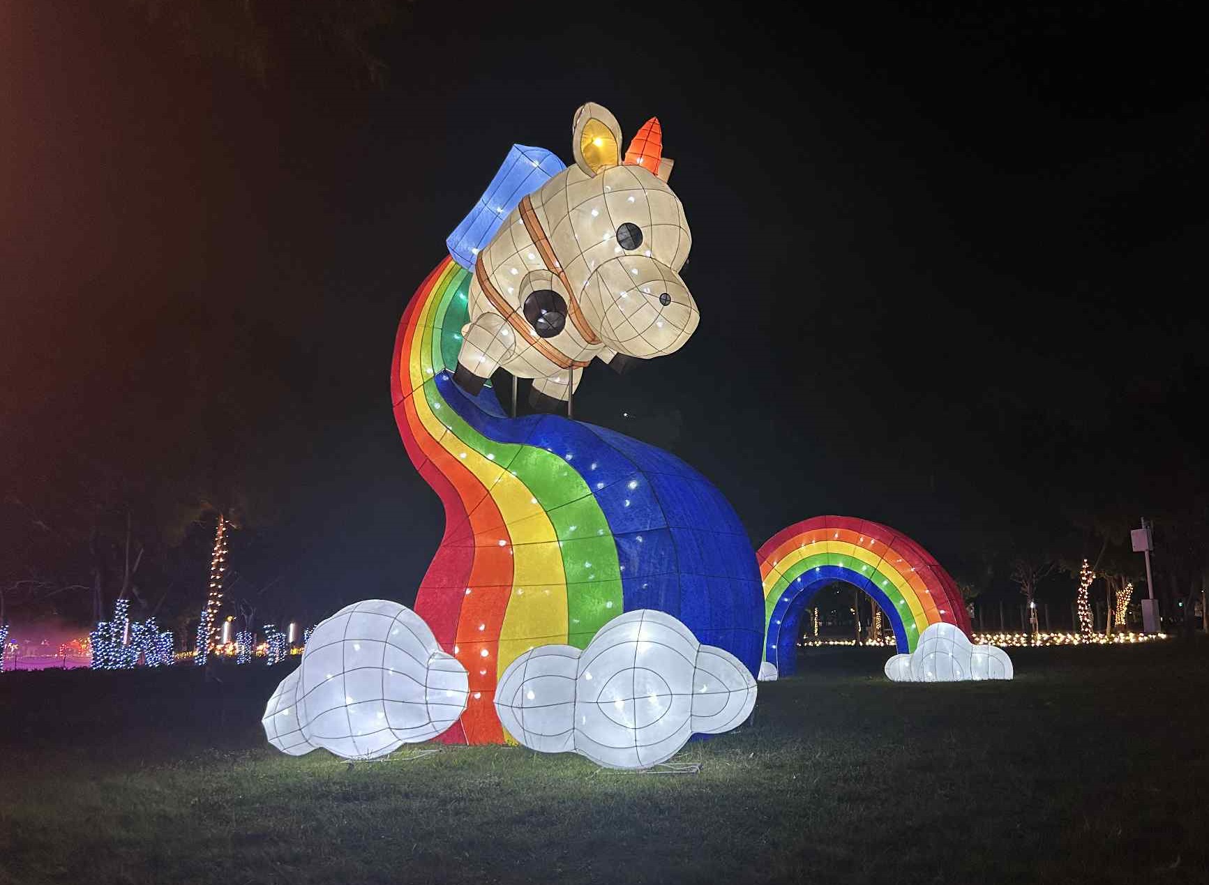 「動物夢世界」燈區規劃許多巨型奇幻風格燈景,值得市民朋友們親身體驗,從古埃及女神巴斯特開啟夢境通道,到「消逝之塔」提醒著快要消失在這世界的動物們,「貓眼凝視」巨大黑貓凝視著人們如何對待動物,「星際救援」來自火星的狗狗來福從飛碟降落,「地下密會」地面冒出鼴鼠與穿山甲,「菇菌密林」巨大的菇勇者展示有機耕作的成果,「星幕共伴」仰望璀璨星空,「希望迴環」神秘又溫柔的庇護所,「希望彩虹谷」飛天小馬在彩虹溜滑梯上遊玩,「幻蝶瀑布」蝶影紛飛的光瀑,最後抵達旅程的終點「擁抱明日」,相信只要願意守護,明天就會更好。