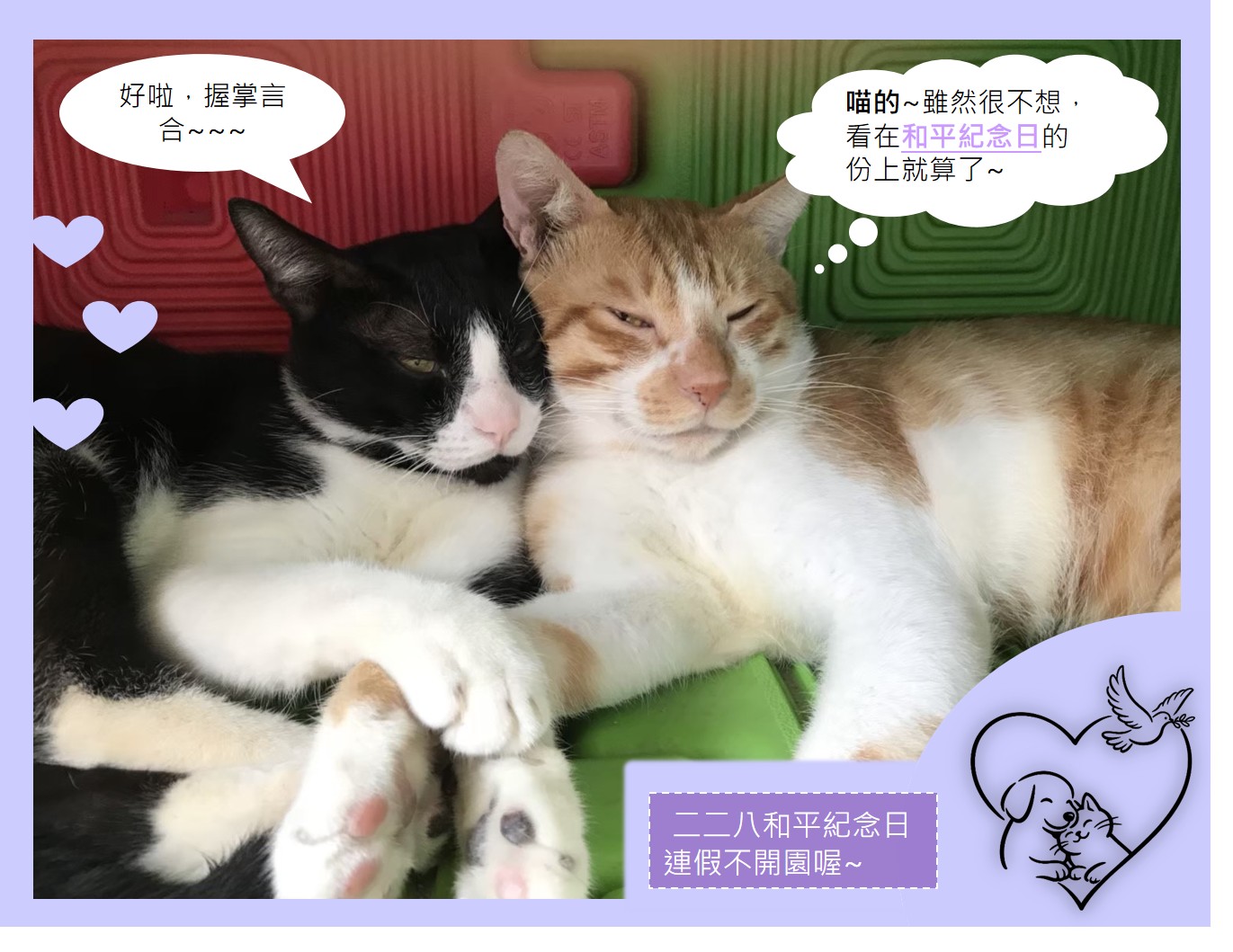 228和平紀念日 本市動物之家於二二八和平紀念日連假期間,本(115)年度2月27日至3月1日不對外開放參觀,僅提供家犬貓領回及拾獲業務;歡迎民眾於開放時間踴躍認領養流浪犬貓及參觀,如有不便之處,敬請見諒。