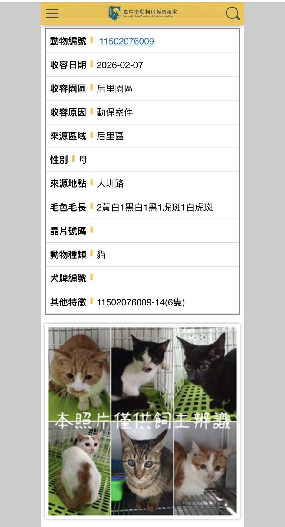 針對民眾反映后里區租屋處疑似有貓隻長期無人照顧情形,動保處表示,已多次依程序前往查處,並於今收到通報後會同警方及里長進行稽查,確認屋內6隻貓隻飼養情況不當,已即刻扣留並帶回動物之家安置。