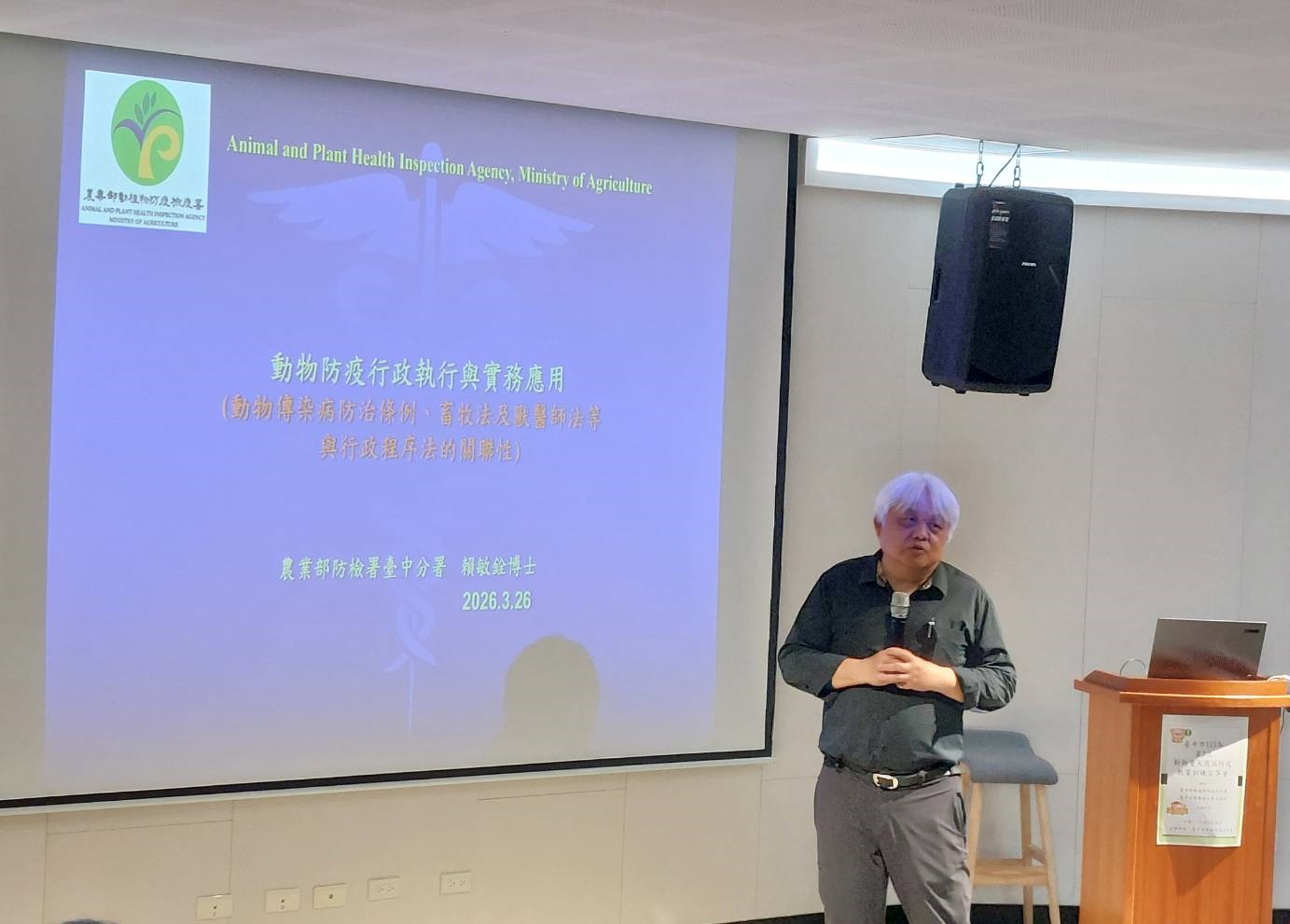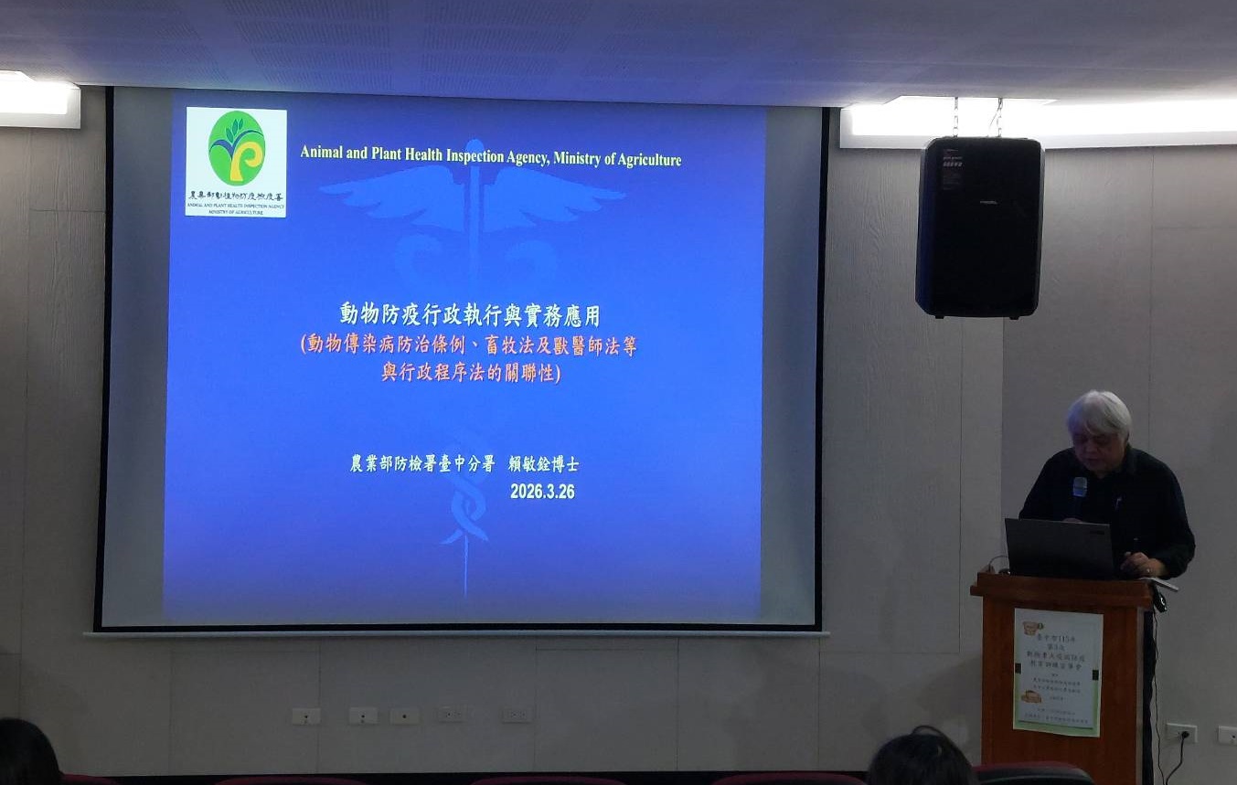 為提升本市動物防疫人員專業知能,臺中市動物保護防疫處於今(26)日辦理「115年第3次動物重大疫病防疫教育訓練宣導會」,邀請農業部動植物防疫檢疫署臺中分署賴副分署長擔任講師,講授「動物防疫行政執行與實務應用」,強化第一線動物防疫人員專業知能與實務應變能力;本次訓練由動保處及各區公所防疫人員共同參與。